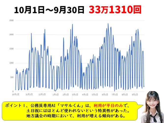 1,公務員専用AI「マサルくん」は、利用が平日のみで、土日祝にはほとんど使われないという特異性があった。地方議会の時期において、利用が増える傾向がある。