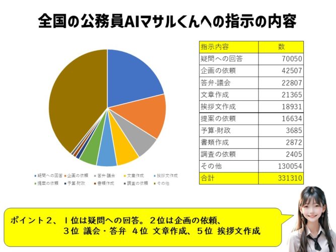 デジタル化の中心がAIになった中で、自治体においてもAIの利活用が進みました。公務員AIマサルくんは、国内の自治体が最も利用していると言われている公務員専用AIです。この33万回のデータを解析する事で、公務員のAIの利用実態がわかりました。
