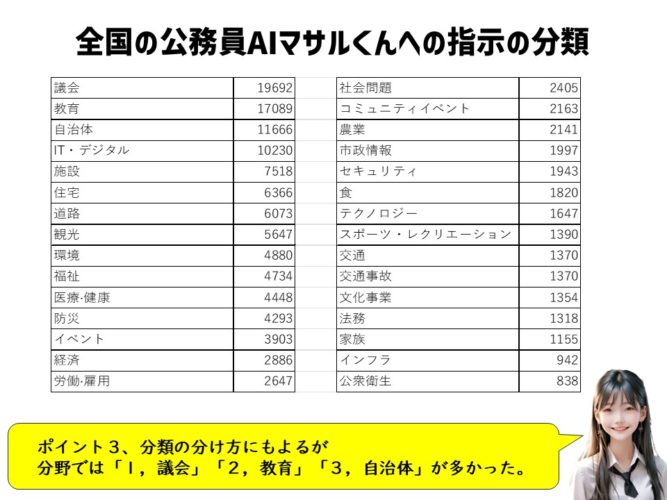3,分類の分け方にもよるが、分野では「1,議会」「2,教育」「3,自治体」が多かった。