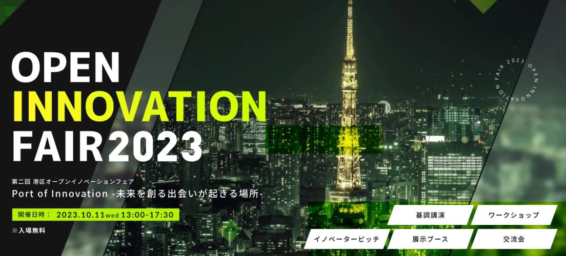 「港区オープンイノベーションフェア」とは、港区立産業振興センターで行う年に一度の「事業規模・業界を超えたイノベーターの祭典」です。今回のテーマは「Port of Innovation~未来を創る出会いが起きる場所~」とし、オープンイノベーション“共創”を起こす仕掛けが会場の各所で開催されました。