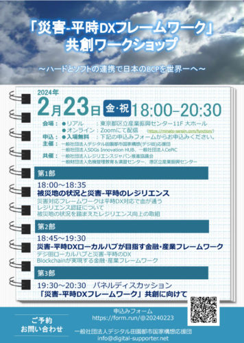 デジ田応援団の主催のもと、「災害-平時DXフレームワーク」共創ワークショップ ~ハードとソフトの連携で日本のBCPを世界一へ~が開催されました。