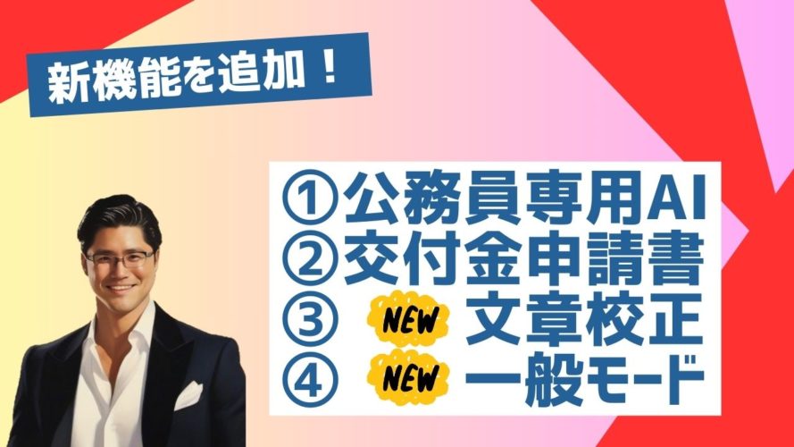 さて、このマサル君は今回、2024年3月に新たに新機能を追加しました。新機能の中身はこちらです。公務員専用の議会答弁や提案書を作るのは今まで通り、交付金申請書も今年1066回も公務員の皆さんに使っていただきました。デジ田交付金申請書、これもこのままです。新しく加えたのが、文章校正システムとノーマル版のチャットGPTです。